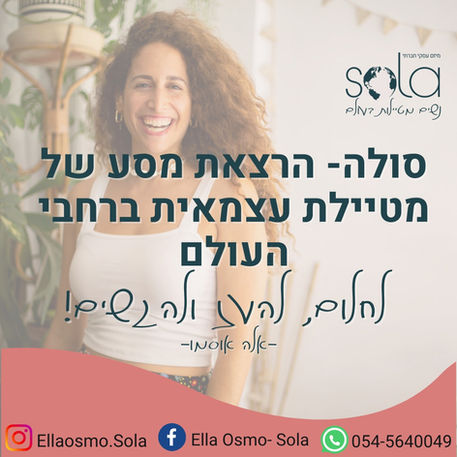 כיום אני מעבירה הרצאות שמספרות את סיפור הגשמת החלום שלי בתור אישה שמטיילת לבד בעולם, מלווה ומייעצת לנשים לפני ובמהלך טיול סולו (סולה) בחו”ל, מנהלת את קהילת סולה- נשים מטיילות בעולם עם כ-400 נשים,מוציאה טיולי נשים ברוח סולה- ביחד ולבד לחו”ל, וממשיכה לחלום וליזום עוד ועוד פרויקטים עם תשוקה וברק בעיניים.