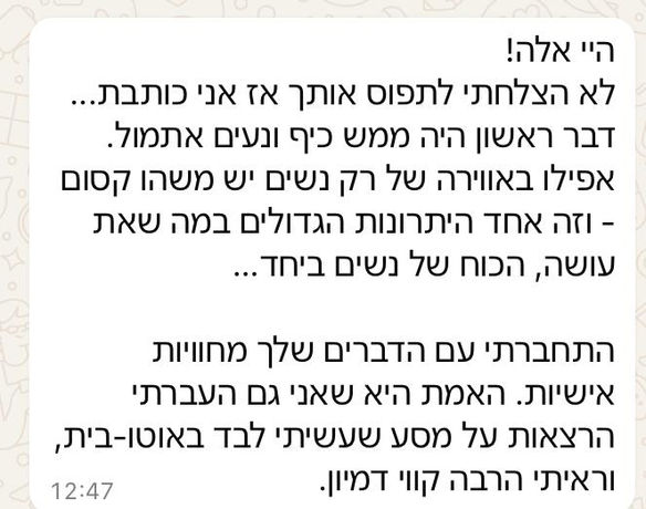 "ההרצאה כולה הייתה מעוררת השראה. אפילו שטיילתי לבד בעולם במשך כמה שנים בשנות העשרים שלי זה משהו שלא עשיתי מעל 6 שנים והבנתי שזה גם בוער בי וגם מפחיד אותי. ואחרי ההרצאה מרגישה יותר אמיצה לחזור לעשות את זה:)"